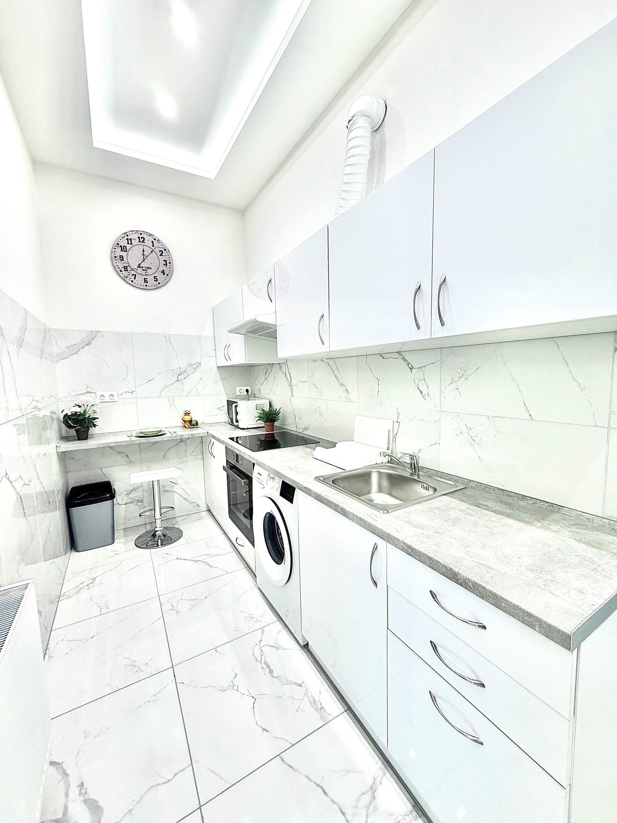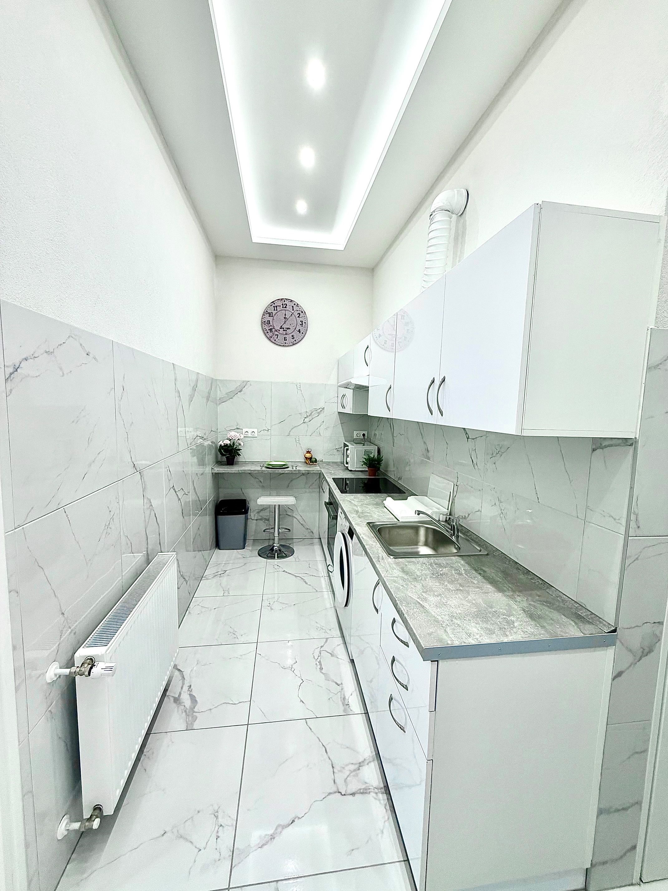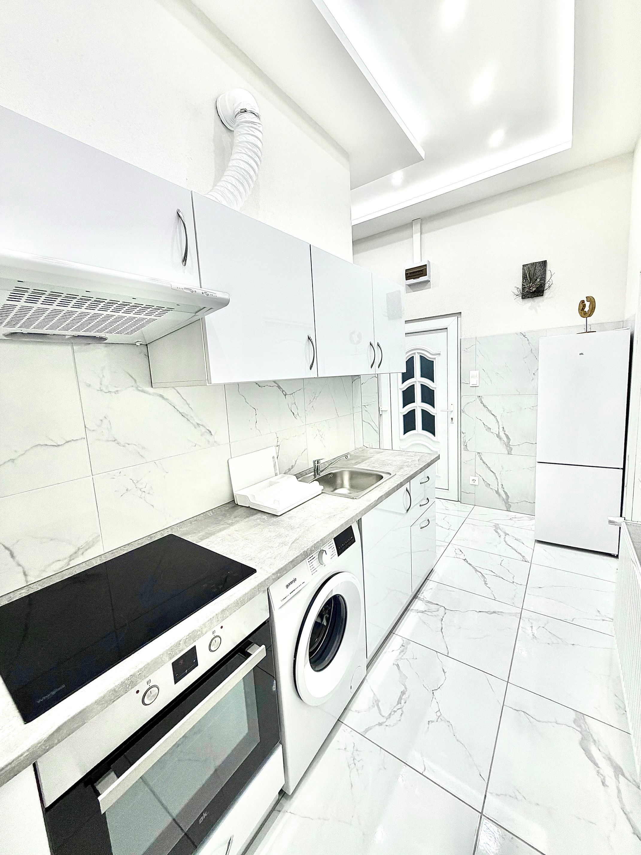 A konyha az előszobával egybenyitott, modern megjelenésű, jól használható elrendezéssel. A mindennapi élethez szükséges alapvető gépek és tárolófelületek rendelkezésre állnak, a konyhai tér funkcionálisan elkülönül a lakótértől, mégis szerves része a lakás egészének.