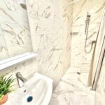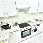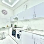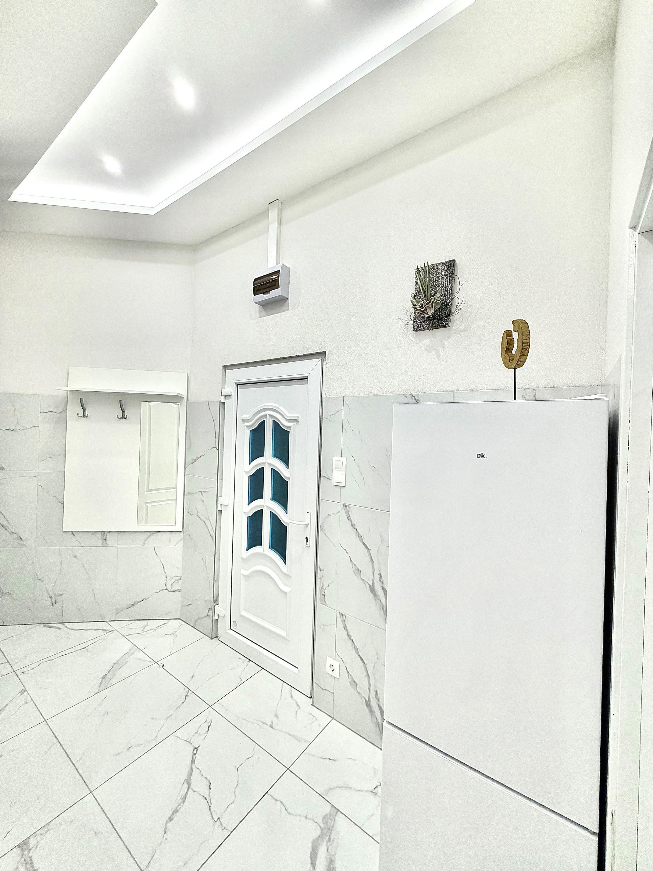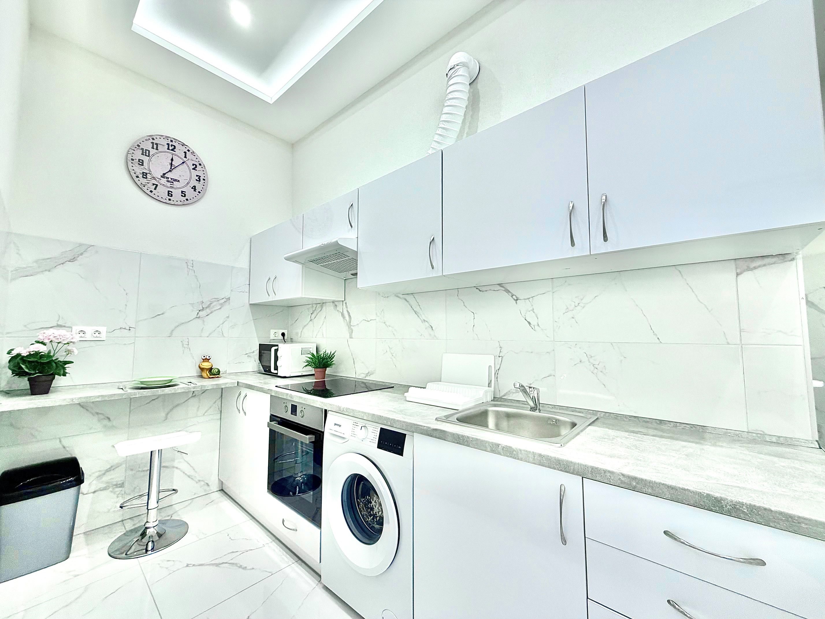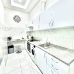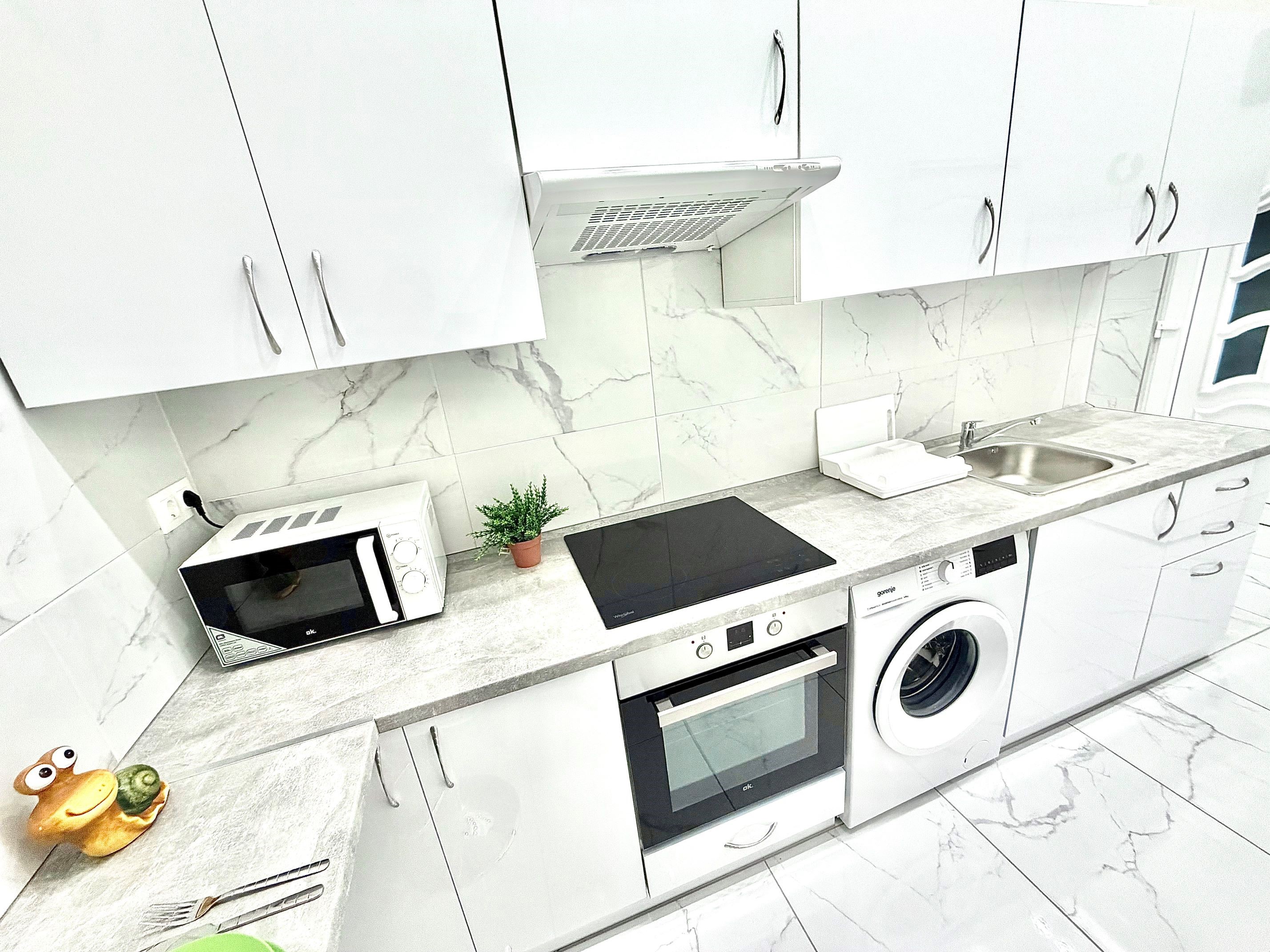 A konyha az előszobával egybenyitott, modern megjelenésű, jól használható elrendezéssel. A mindennapi élethez szükséges alapvető gépek és tárolófelületek rendelkezésre állnak, a konyhai tér funkcionálisan elkülönül a lakótértől, mégis szerves része a lakás egészének.
