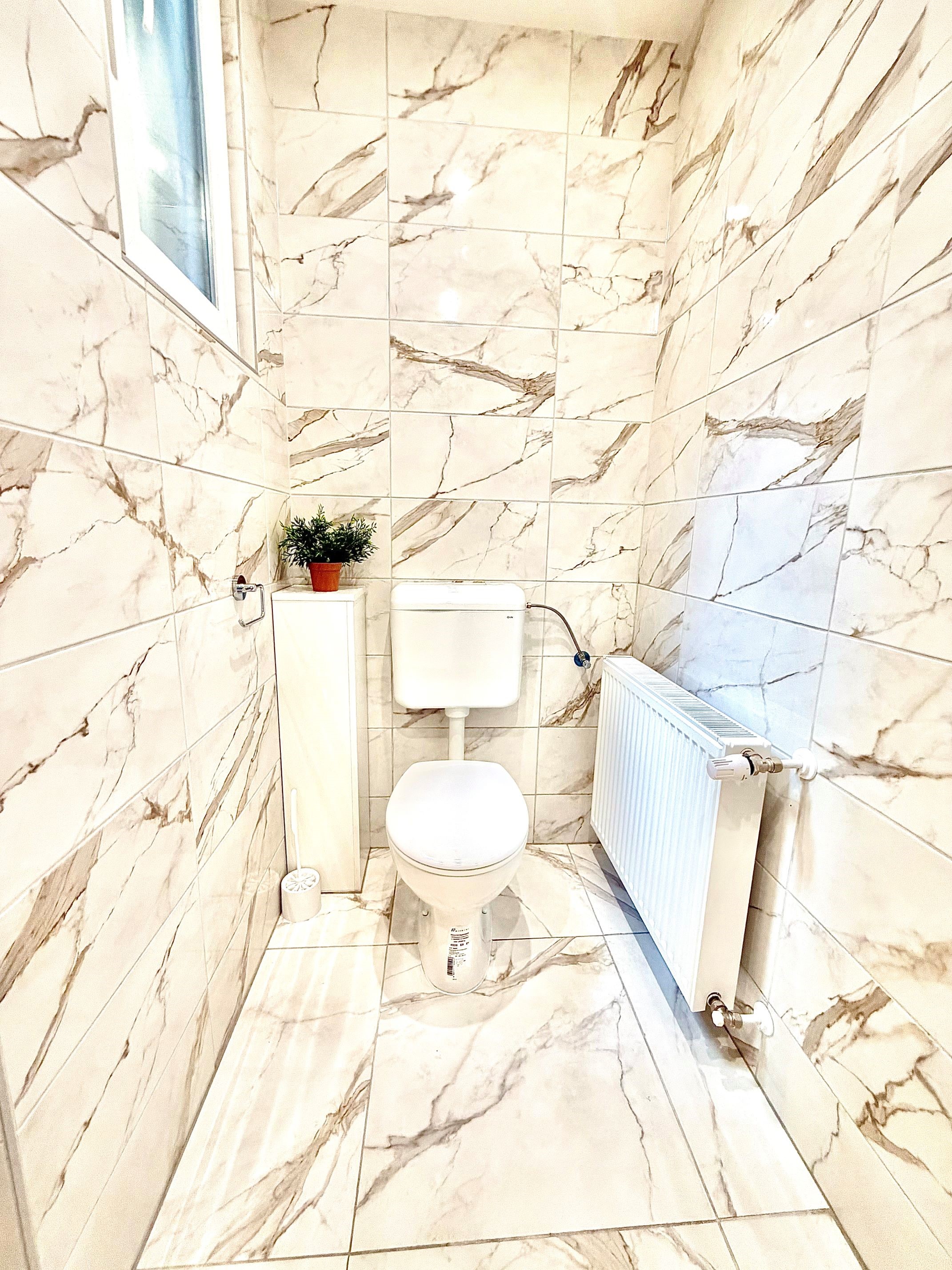 A fürdőszoba saját használatú, WC-vel egyben kialakított, tiszta, rendezett állapotú. A lakás fűtése gáz cirkóval, radiátoros hőleadással történik, amely jól szabályozható és gazdaságos megoldást biztosít.