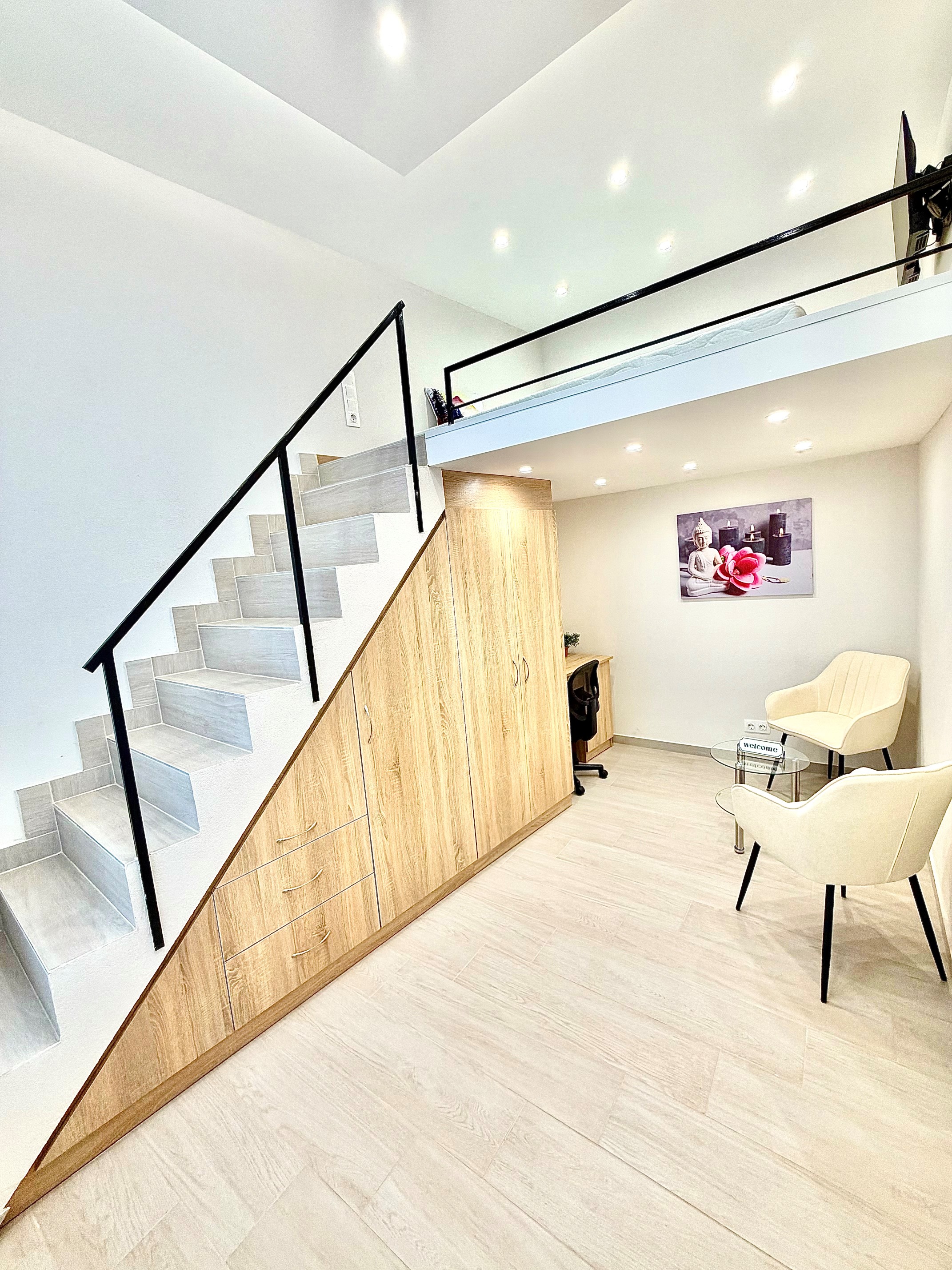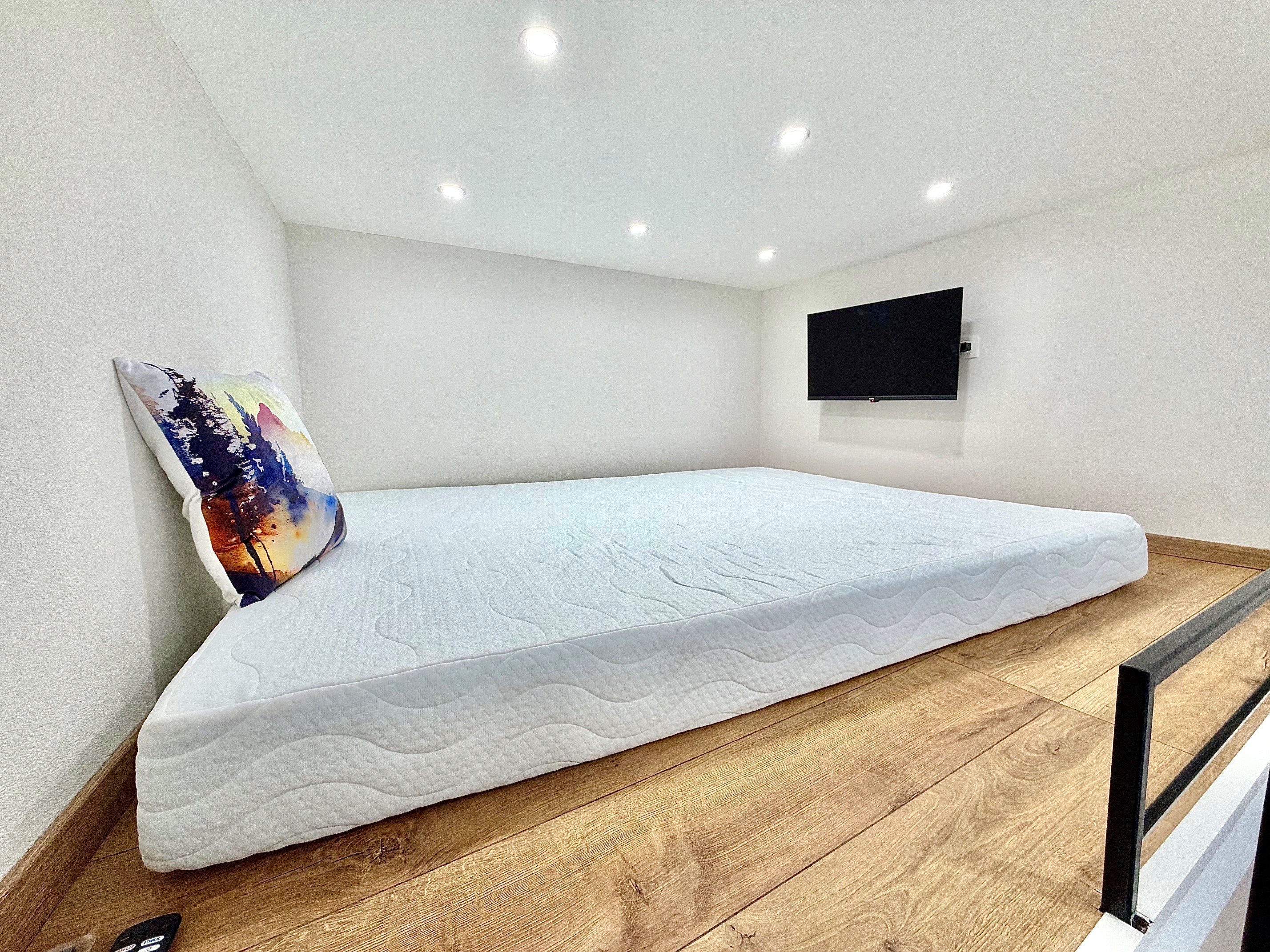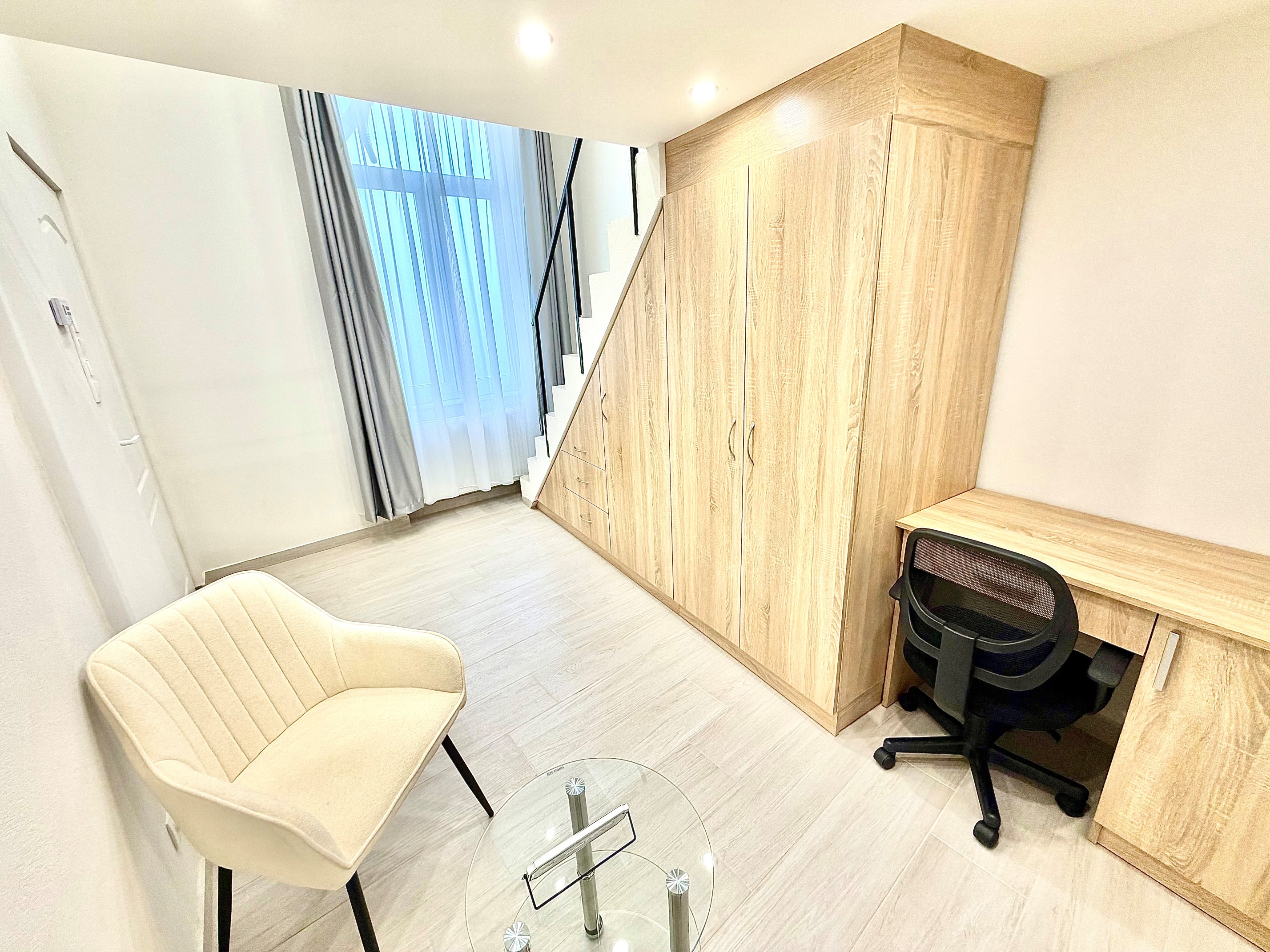 A szoba világos, udvari nézetű, így kifejezetten csendes, nyugodt lakókörnyezetet biztosít. A galérián egy kényelmes, 180×200 cm-es matraccal ellátott ágy kapott helyet, míg az alsó szinten nappali- és dolgozótér lett kialakítva. A lakás berendezése magában foglalja a szükséges bútorokat: szekrényeket, íróasztalt, forgószéket, valamint televíziót is.