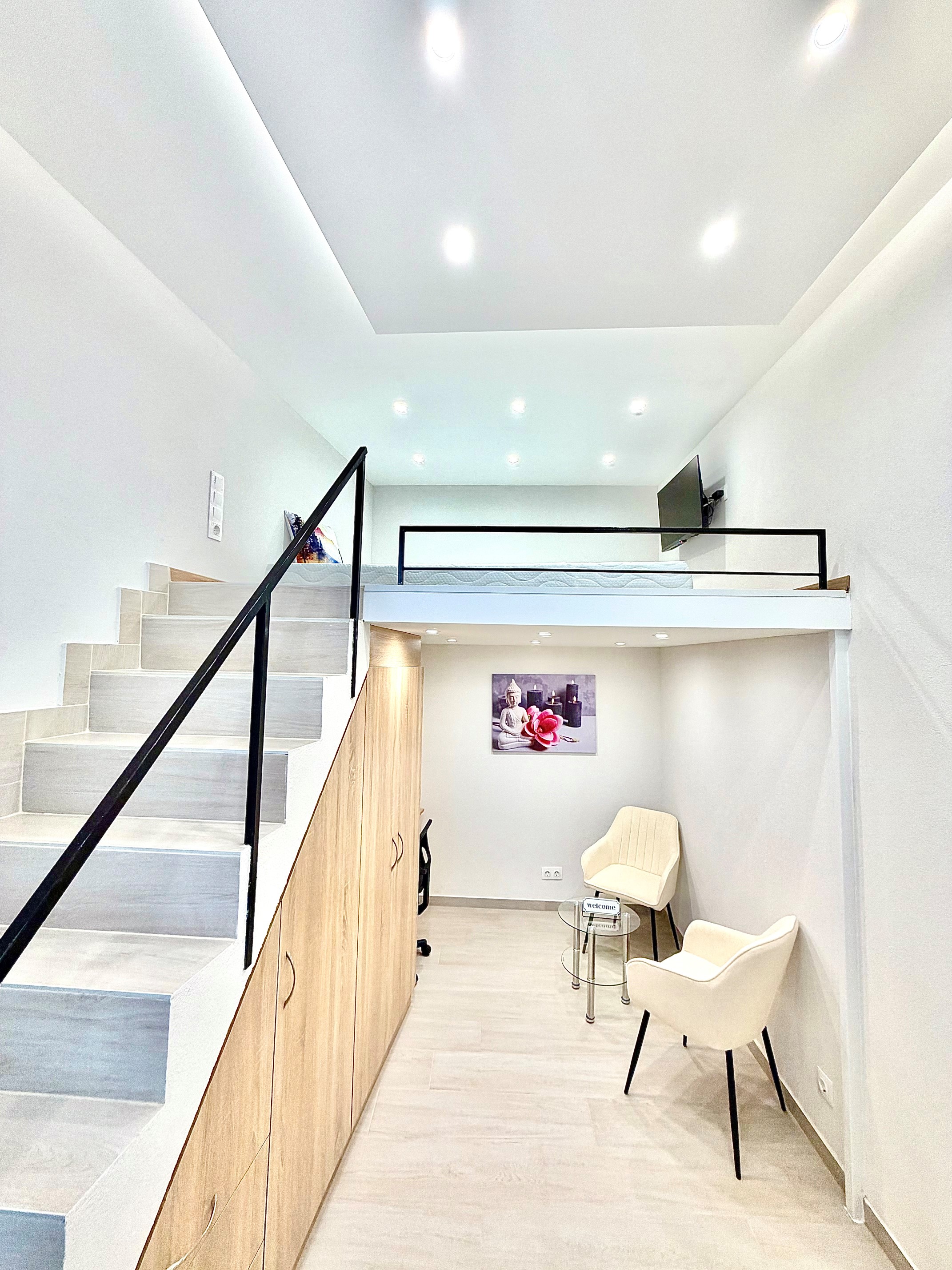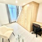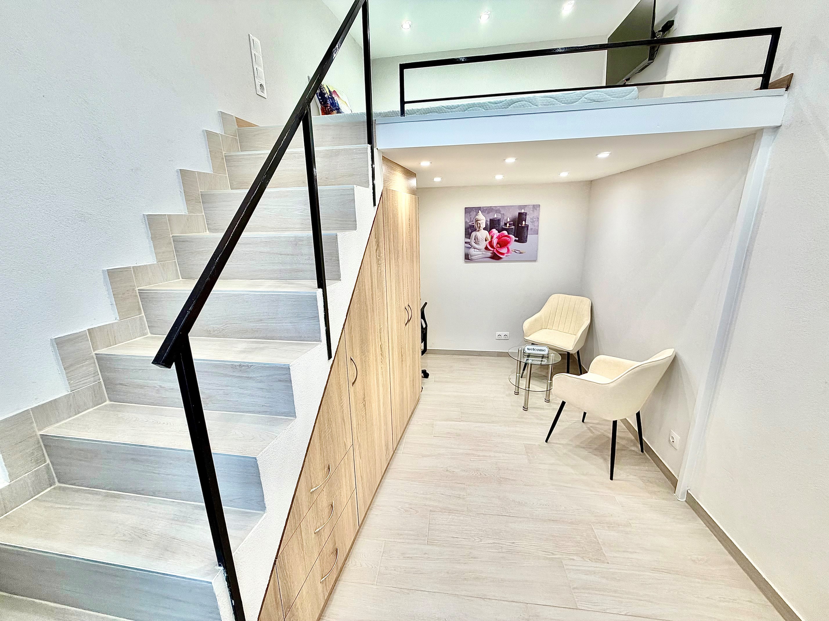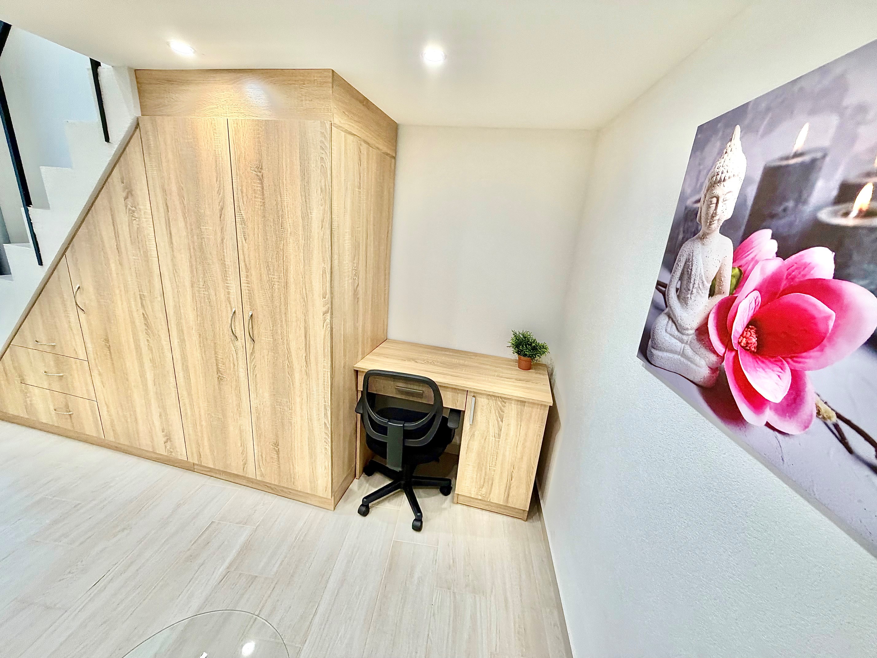 A szoba világos, udvari nézetű, így kifejezetten csendes, nyugodt lakókörnyezetet biztosít. A galérián egy kényelmes, 180×200 cm-es matraccal ellátott ágy kapott helyet, míg az alsó szinten nappali- és dolgozótér lett kialakítva. A lakás berendezése magában foglalja a szükséges bútorokat: szekrényeket, íróasztalt, forgószéket, valamint televíziót is.